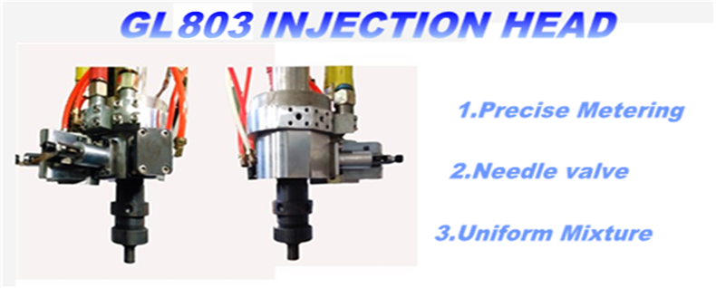1) Material injection by a precision needle valve,which is taper sealed,never worn,and never clogged,the mixing head produces complete material stirring;